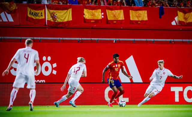 另外一侧由于尼科·威廉斯不在,德拉富恩特在边卫位置派上了攻击性更强的格里马尔多替代库库雷利亚首发,勒沃库森左边翼开场仅仅4分钟就第一次威胁到丹麦的球门,随后也制造出几次威胁,但同样收效甚微。上半场西班牙进攻端整体略显低效,丹麦人坚决贯彻低位防守,很少考验到西班牙首发门将拉亚,而西班牙虽然各项数据占优,但真正有威胁的机会并不算多。